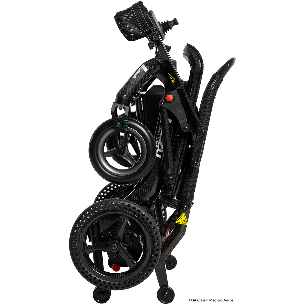 The AeroLux Carbon by Travel Buggy is the lightest, most durable, folding power chair we've seen. It weighs only 29 lbs. Allowing users to navigate both indoor and outdoor environments with large 11" rear tires and dual front shocks to make for a smooth ride. The lightweight and cross-fold design measures only 9” in width, making it easy to store and transport.